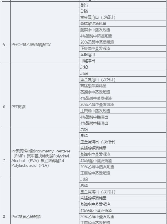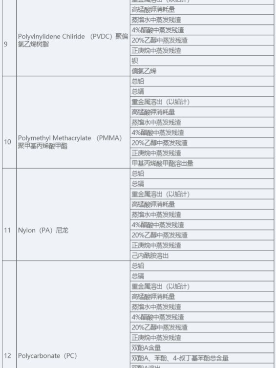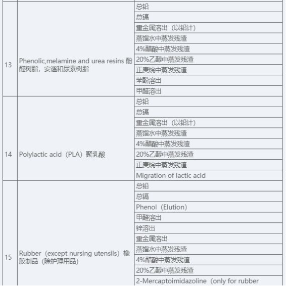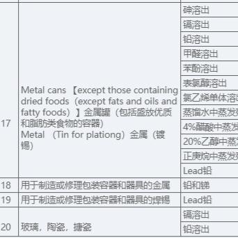 各种和食品接触的材料,包括金属、塑料、硅橡胶、涂层、玻璃、陶瓷、木材、纸张等。