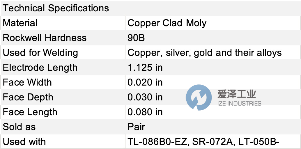 EU2030M UNIBOND 电极用于平行间隙键合和回流焊接。它们由铜包钼制成,洛氏硬度为 90B。它们是焊接铜、银、金及其合金的理想选择。