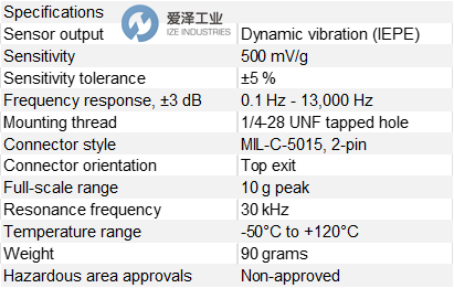 加速度传感器,极低频(低端 0.1 Hz),高增益,灵敏度500 mV/g,灵敏度容差±5%,顶部 MIL-C-5015型连接器,外壳隔离