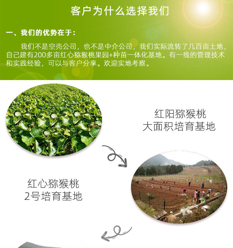 我处是四川果树种苗生产批发基地,每年用野生猕猴桃种子播种培育的原生猕猴桃砧木苗200万株左右。此砧木苗采用野生猕猴桃种子播种培育而成,苗干有硬绒毛,又称硬毛猕猴桃。此砧木苗再生能力强,成活率很高,生长速度快,抗病力强,根系发达,与多种猕猴桃接穗的亲活力强,嫁接成活率98%以上。嫁接以后的果树成品苗使用年限大大延长,所以很受广大种植户的喜爱。我们每年批发猕猴桃砧木苗200余万株,地径0.50cm以上,是嫁接优良品种理想的砧木。其他各规格的都有,可以选购。随着市场行情的变化,价格随行情涨跌,但我们始终以合理的价格批发,薄利多销,货真价实。红心猕猴桃苗是指红阳猕猴桃又名红心奇异果/红心猕猴桃,特性是果实中大、整齐;果实为短圆柱形,果皮呈绿褐色,无毛。含糖分高,富含钙、铁、钾等多种矿物质及十七种氨基酸,维C高达135。果汁甜酸适中,清香爽口,品质极优。可直接食用,也可适合制作工艺菜肴。