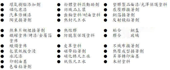 因為PVB 樹脂本身含有不少比例的羥基(Hydroxyl group),所以可以跟一些熱固型樹脂發生架橋反應(crosslinking)來提昇耐化學藥品性及塗膜硬度等性能。由於PVB樹脂具有上述的各種優異物性,所以被廣泛的應用於汽車與建築物的膠合 玻璃中間膜、伐銹底漆、烤漆、木器漆、印刷油墨、電子陶瓷及印刷電路板之接著劑、金屬與金屬、金屬與塑膠間之接著劑、熱熔膠之改質劑、紡織品纖維防水加工等。各種工業上的新用途也持續不斷的被開發應用。