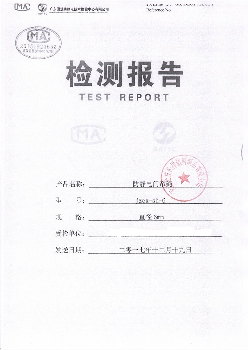 检测报告:直径6mm防静电门帘绳比电阻1.0×103Ω/m. 垂绳间距:推荐采用2厘米或5厘米.