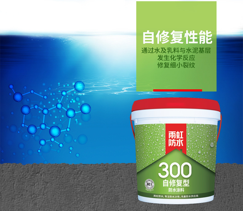雨虹300自修复型防水涂料是以高环保改性聚合物乳液和优质水泥及多种功能助剂制备而成的双组份功能型水性防水涂料。具有优越的自修复性能,能够在水的作用通过溶胀粘连以及乳液中的化学基团与水泥水化产物反应修复防水涂膜出现的微小裂纹、同时具备拉伸强度高、柔韧性好、与基层粘结牢固的特点。