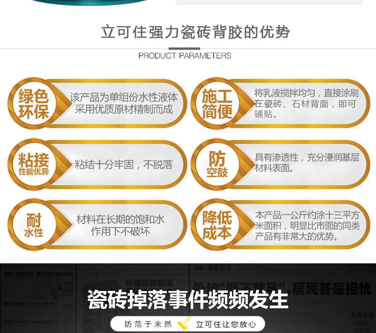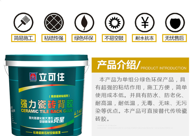 立可住瓷砖背胶 玻化砖背胶 强力瓷砖背涂胶 高分子胶粘乳液 特殊功能助剂经二次合成制备 具有超强粘结力 广泛用于玻化砖 玻璃马赛克 大理石等的粘贴 具有防水 防老化 适应于高温 低温 无毒无味 无污染等优点 欢迎订购