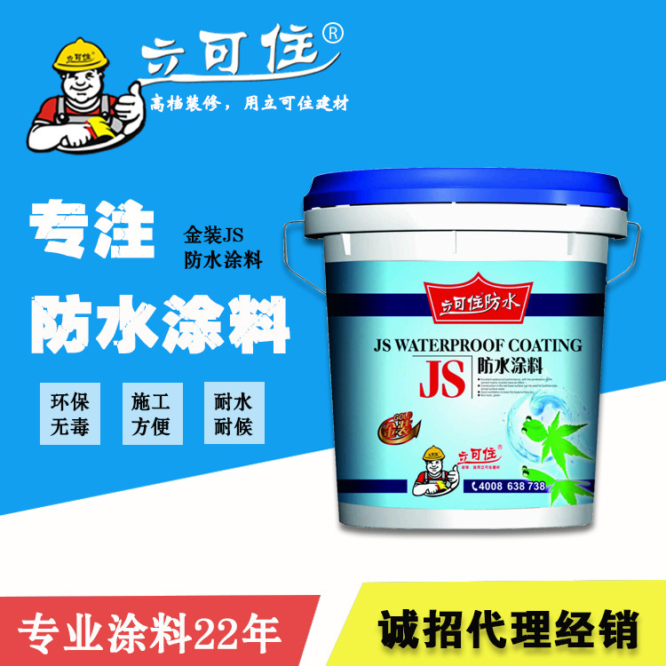 立可住JS水性涂料 水泥基渗透结晶型防水 金装js防水涂料 是采用环保型乳液和无机粉 添加多种助剂 精制而成的双组份防水涂料 具有有机材料弹性好 又有无机材料耐久性 耐候 耐水性好等优点 欢迎订购