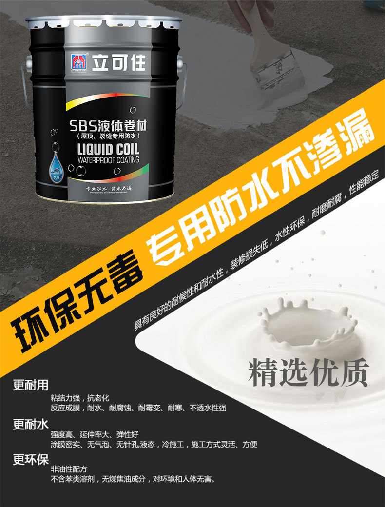 立可住液体卷材 sbs水性液体卷材 本产品是采用非油性配方 不含苯类溶剂 无环境污染 环保无毒 粘结力强 涂膜密实 弹性好