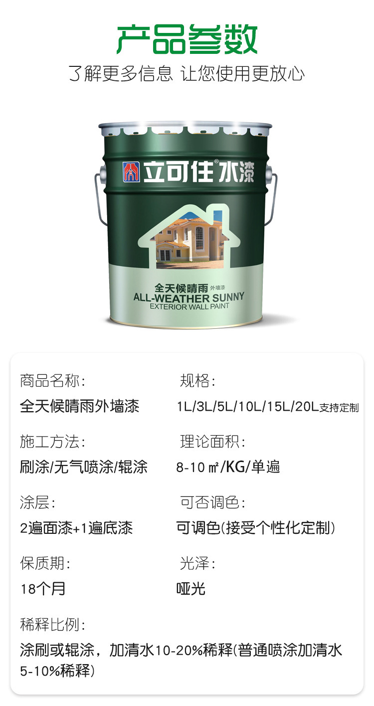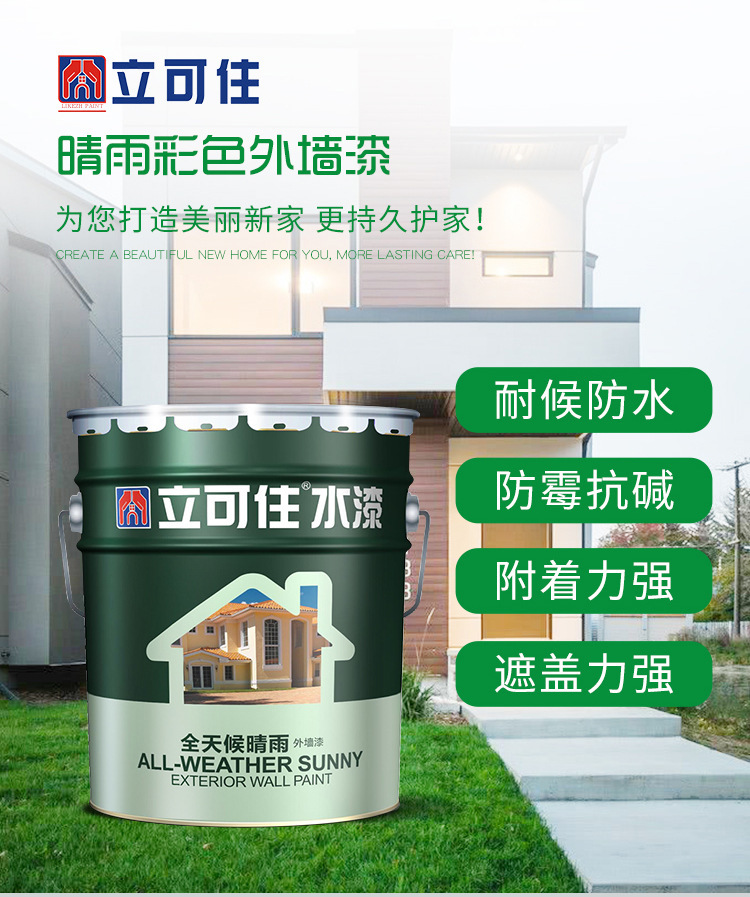 特色服务 : | 厂家提供施工技术指导 | 立可住 外墙乳胶漆 : | 立可住水性外墙漆 抗紫外线防霉 |