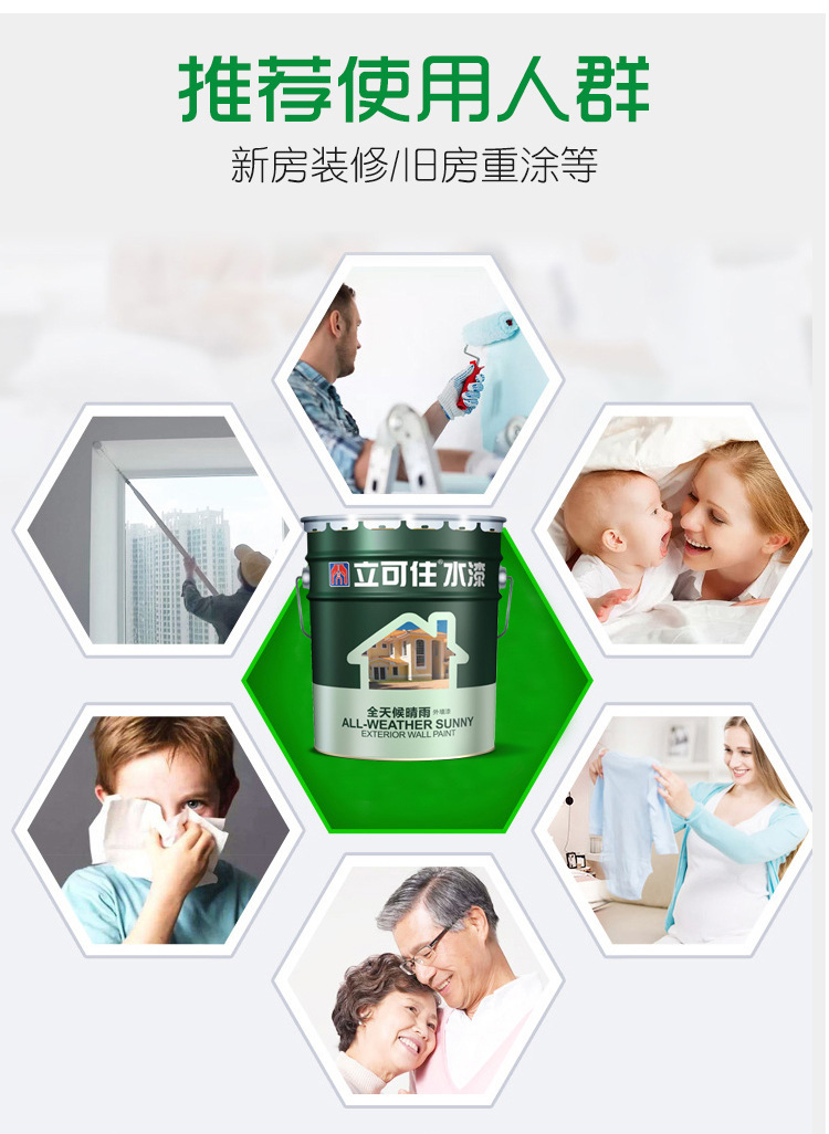 立可住 外墙乳胶漆 水性外墙弹性涂料 采用乳液及填充料精细加工作而成 立可住晴雨彩色外墙漆 具有耐候防水 防霉杭碱 阻着力强 墙面不起皮等特点 现货供应 欢迎订购
