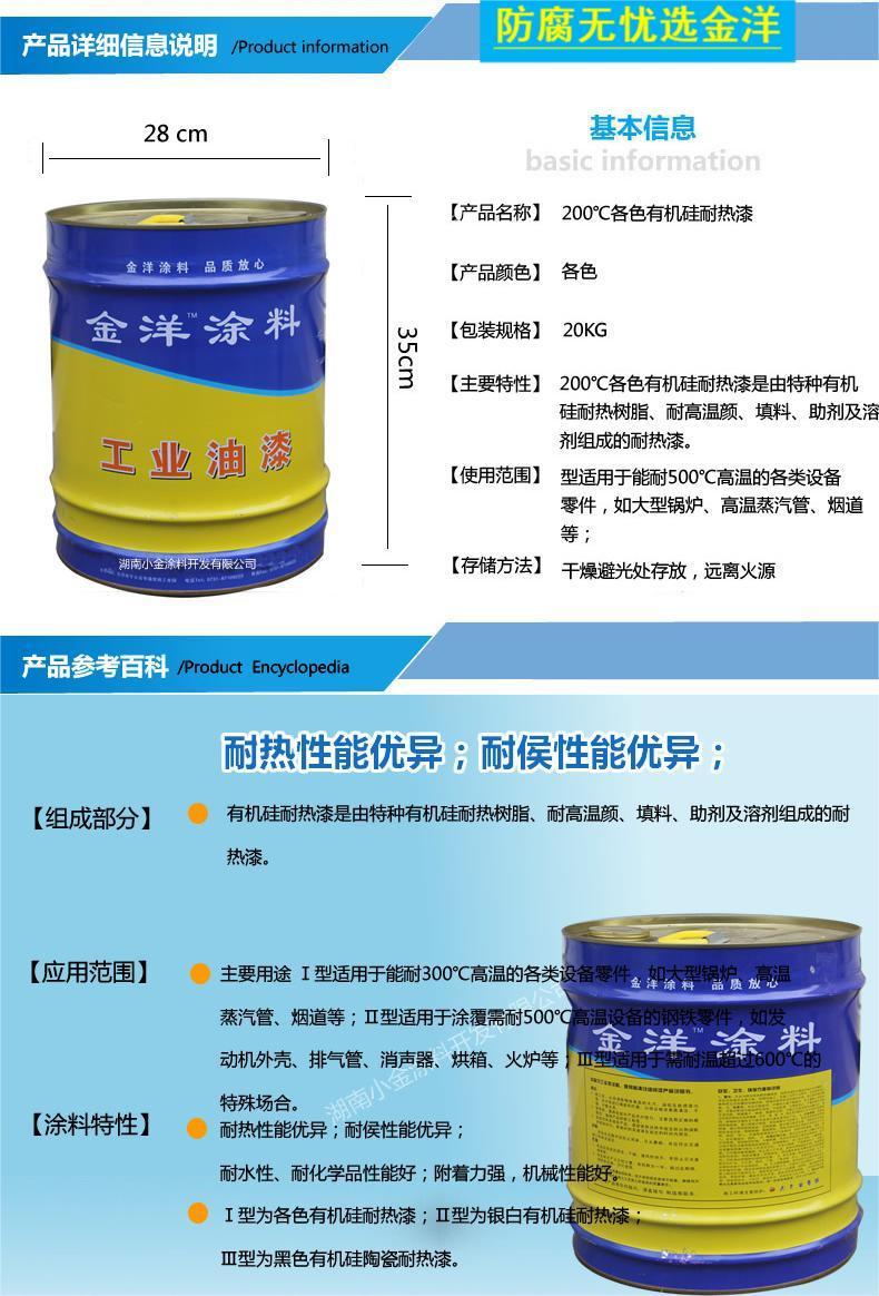 金洋200℃各色有机硅耐热漆 有机硅耐热树脂 耐高温颜 填充料 助剂及溶剂组成 具有耐高温300度各类设备 大型锅炉 蒸气管 烟道 排气管 火炉等
