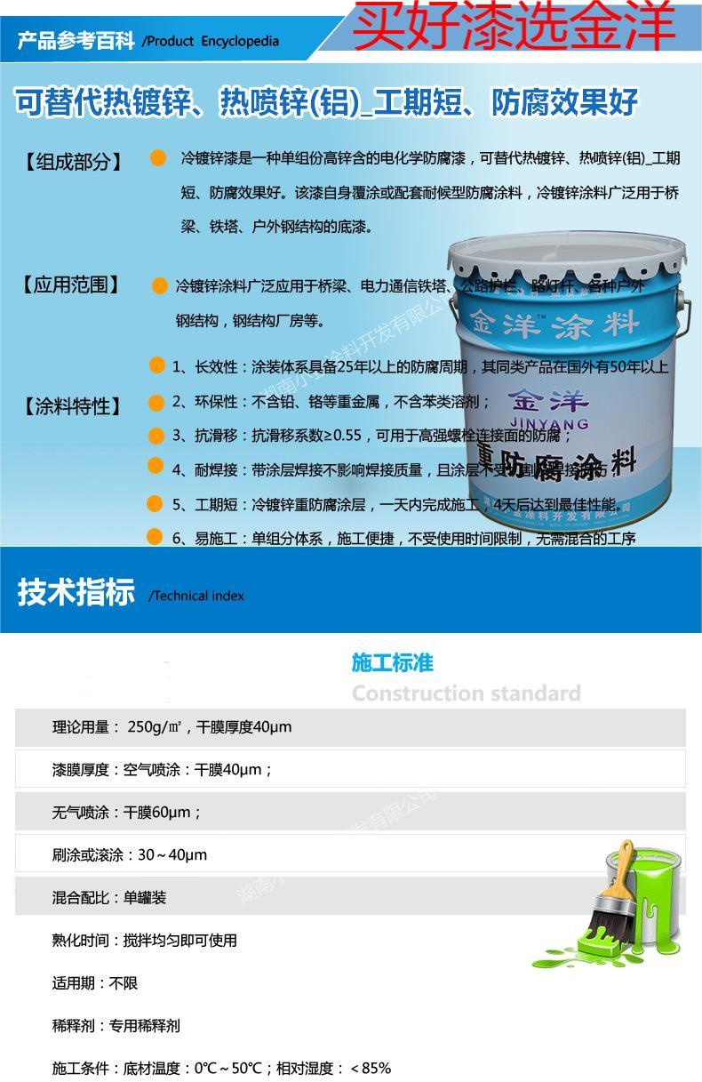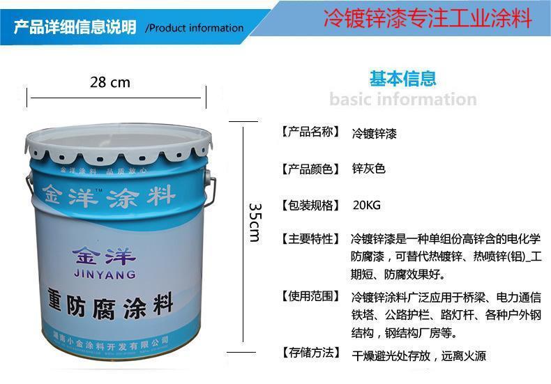 金洋冷镀锌底漆 冷喷锌底漆 冷镀锌漆是采用单组份含锌量高的电化防腐漆 可替代热镀锌 冷镀锌涂料广泛用于外架桥梁 电力通信铁塔 路桥护栏 户外钢结构等建设设施 欢迎前来订购