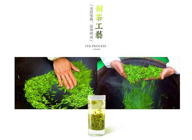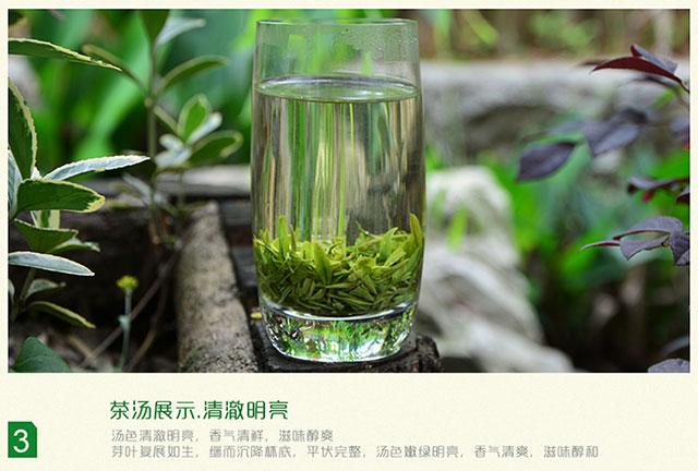茶叶特点:条索紧细、圆直、微露白毫,色泽苍翠润绿,形如松针,茶汤清澈明亮、香气清鲜、滋味醇爽