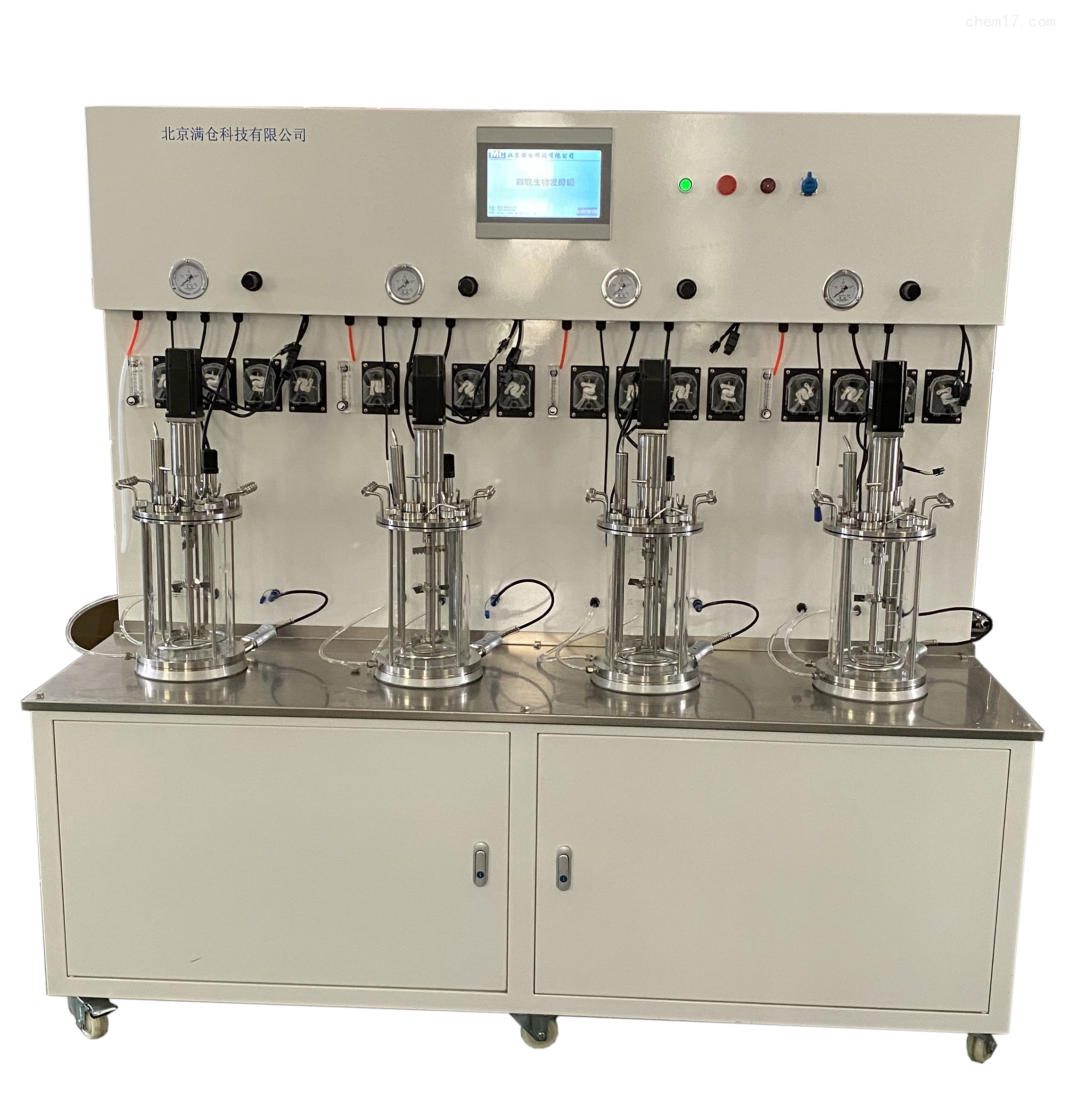 系统由厌氧发酵罐(小罐玻璃罐,大罐不锈钢罐,500ml~100L)、反应过程自动控制监测系统(传感器与一次仪表)、配套系统,是集机械和控制一体化的设备。可以选择下位机控制系统(现场PLC控制系统,二次仪表)触摸屏显示及控制。