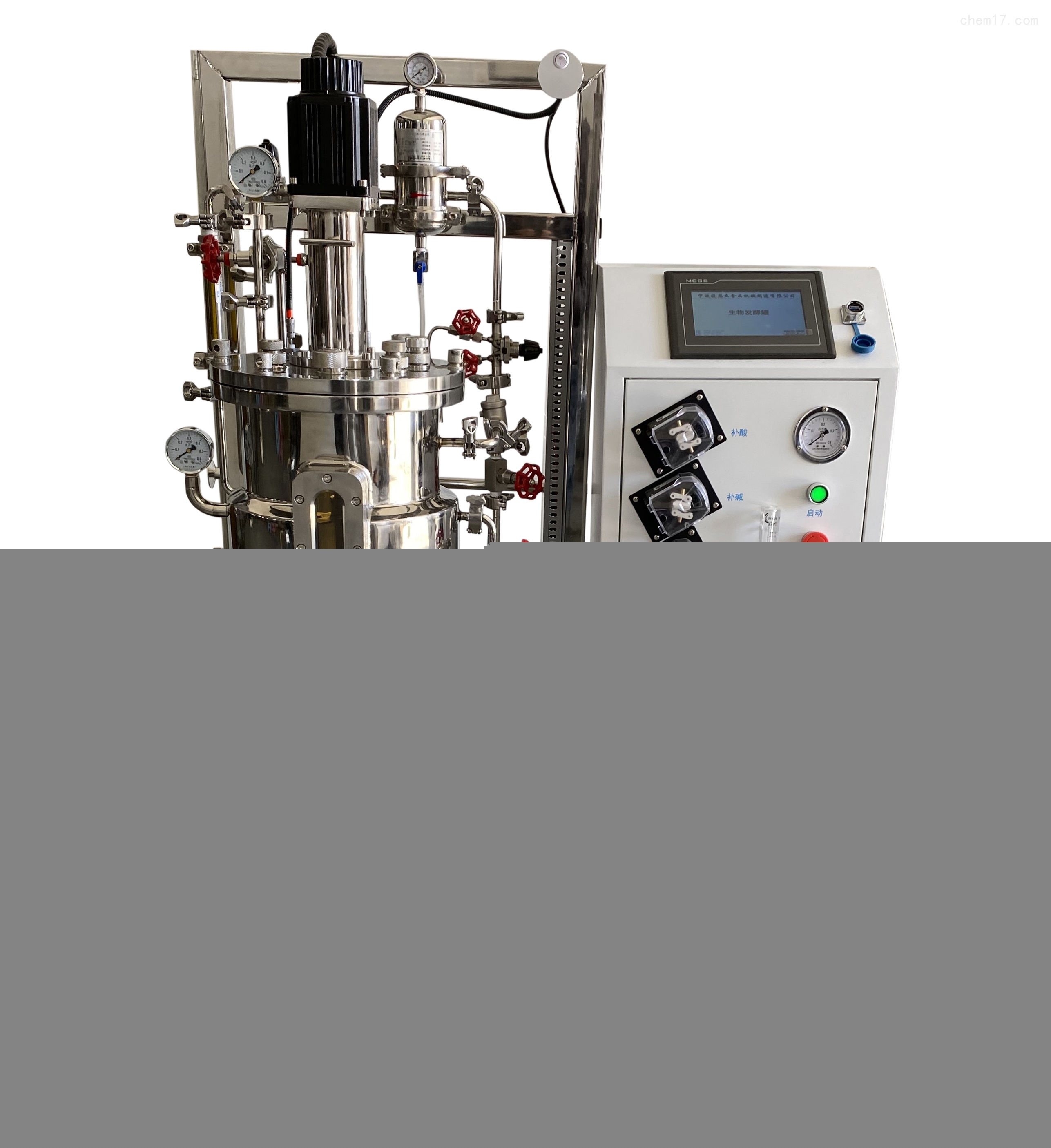 系统由厌氧发酵罐(小罐玻璃罐,大罐不锈钢罐,500ml~100L)、反应过程自动控制监测系统(传感器与一次仪表)、配套系统,是集机械和控制一体化的设备。可以选择下位机控制系统(现场PLC控制系统,二次仪表)触摸屏显示及控制。