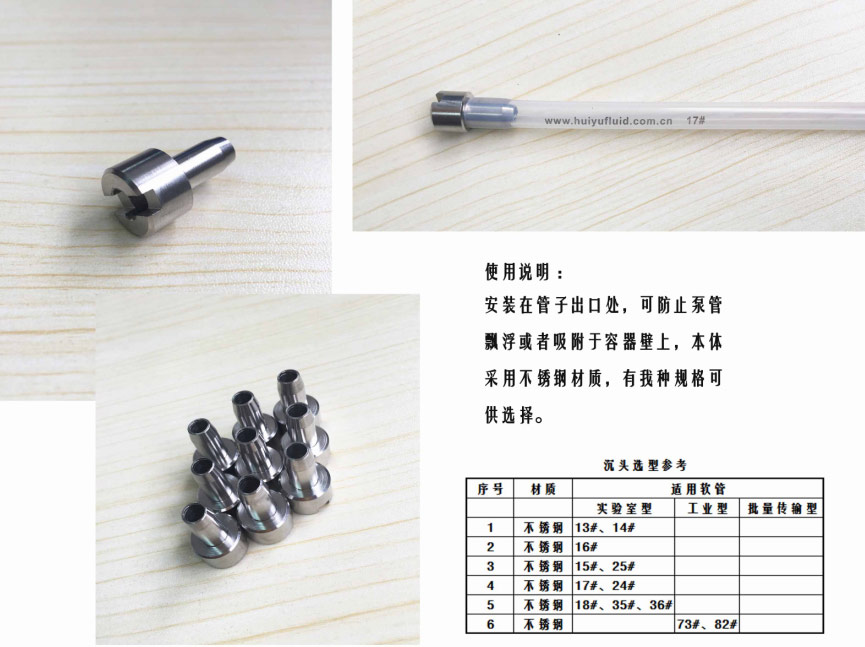 材质不锈钢,连接在管子出口处使用,防止泵管飘浮或吸于容器壁上 ,从而使流体完全被吸入,确保传输的稳定性和精度。