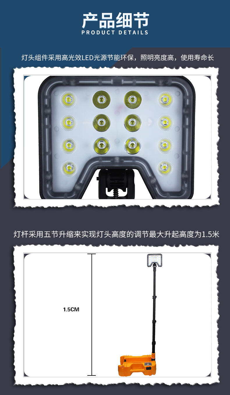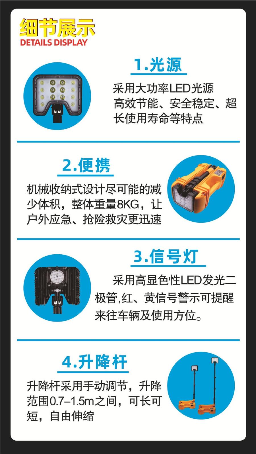 灯具功能多样,更具人性化。集聚光/泛光照明、电量显示、无极调光、信号警示等功能,满足用户不同环境下使用的需求采用标准USB充电接口,可为大部分手机等数码产品充电,解决用户在户外作业时手机或其他数码产品电量用尽无法使用的烦恼;