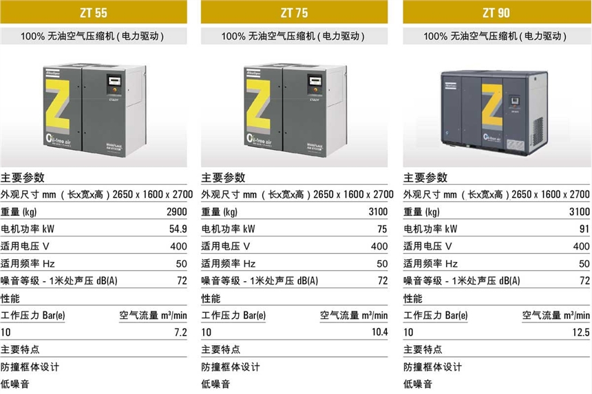 贤易压缩空气租赁提供阿特拉斯全系列空压机租赁服务,ZT22-ZT315VSD。ZR75-ZR750,ZH450-ZH15000等机型一站式租赁服务。ZT250无油空气压缩机设备提供100%无油压缩空气租赁服务。