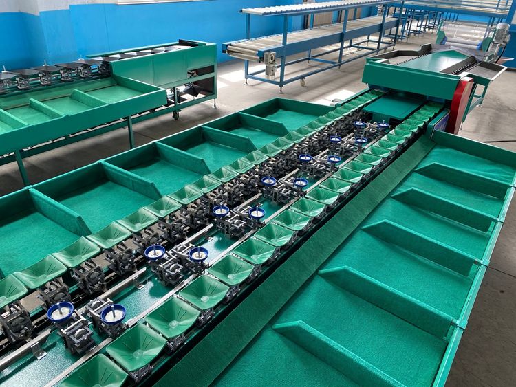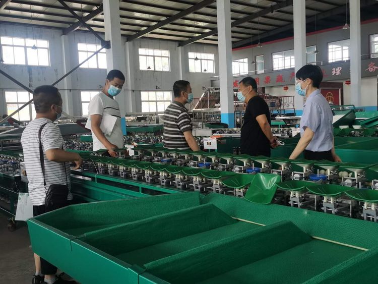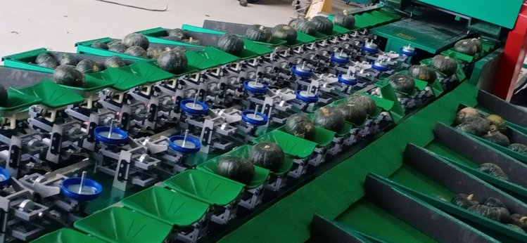 8、选果机先进的预排列技术。只需人工将水果倒在输送带上或上料斗,机械自动将水果进行排队,一个一个落入果盘进行称重分选。