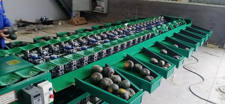 分选机出口果斗多种选择:可以做成通道式直接流下来,适合分选柠檬猕猴桃百香果贝贝南瓜,也可做成盛料斗形式,每个果斗可存放40斤水果,适合苹果桃子石榴等果蔬。