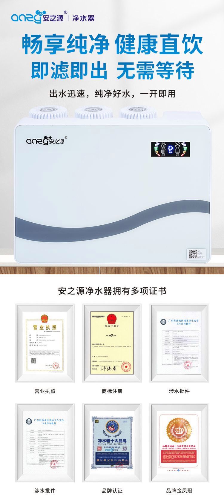 安之源(anzy)智能冲洗100G长效滤芯五级净化家庭厨房RO纯水机自来水出水直饮净水器智能型