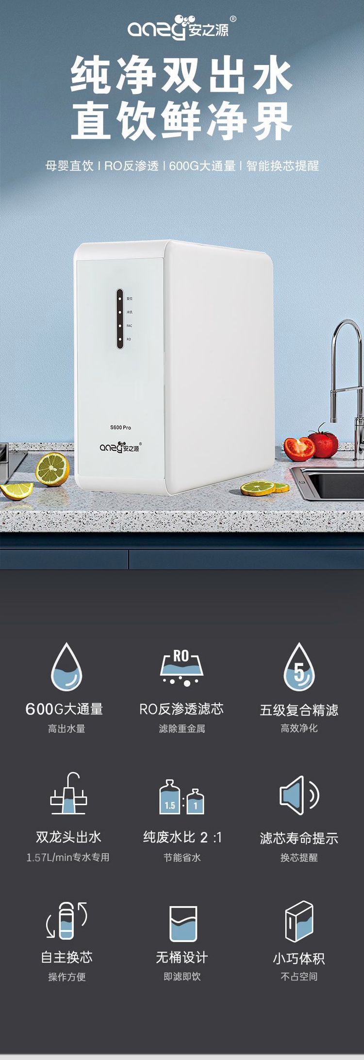 安之源(anzy)出水直饮RO反渗透大通量除细菌杂质带耗材提醒功能家用净水机A600
