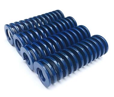 产品的颜色:模具弹簧有不同的颜色,代表着弹簧的载荷等级,反映出了压缩弹簧的压缩量以及弹力的大小。常用的模具弹簧的颜色有黄色、蓝色、红色、绿色、茶色,从小到大代表的载荷等级是较小荷重KF、轻荷重KL、中荷重KM、重荷重KH、超重荷重KB。在这里,茶色在不同的标准中,还被称为棕色、橙色等。