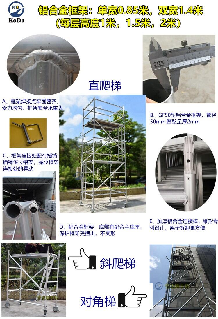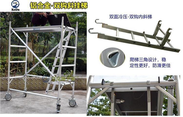 空达双宽垂直爬梯式铝合金脚手架是目前使用较广泛的铝合金脚手架,垂直爬梯设计,既能解决上下铝合金脚手架爬梯的问题,同时又能让搭建拆卸脚手架变得简单轻松,平台板可以搭设在框架上的任意阶段,更方便了需要经常变动作业高度的施工需要。双宽度垂直爬梯式铝合金脚手架既能节省了斜爬梯的制造成本,又解决了上下铝合金脚手架的问题是更具性价比的一款产品。