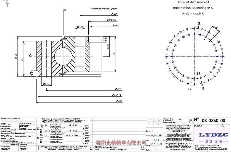 我们生产的轴承是一种能够同时承受较大的轴向负荷、径向负荷和倾覆力矩等综合载荷的特殊结构的大型轴承。一般情况下,转盘轴承自身均带有安装孔、润滑油孔和密封装置,可以满足各种不同工况条件下工作的各类主机的不同需求;另一方面,转盘轴承本身具有结构紧凑、引导旋转方便、安装简便和维护容易等特点,被广泛用于起重运输机械、采掘机械、建筑工程机械、港口机械等大型回转装置上。我们生产的转盘轴承根据不同的结构型式可以分为四点接触球转盘轴承、双排角接触球转盘轴承、交叉圆柱滚子转盘轴承和三排圆柱滚子组合转盘轴承等不同的结构型式上述各类轴承按其是否带齿及轮齿的分布部位又分为无齿式、外齿式或内齿式等不同结构。