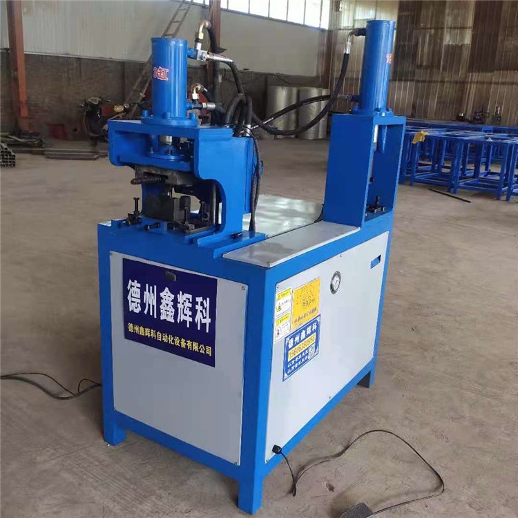 方管切45度,折角90度一次成型机,使用范围广,可用于钣金加工,货架,电柜,厨具,橱柜厂,不锈钢行业,防盗门窗厂,五金厂等。不锈钢切角45度、铝材切角机、方管90度切角机、方管切角机。冲孔机主要应用于不锈钢门窗冲孔、楼梯扶手冲斜弧口、各种五金冲孔模具、(防盗网)冲孔、格栅冲孔、电动门、拉闸门伸缩门冲孔、围栏冲弧、铁管冲孔、护栏压枪尖机、锌钢管冲弧口加工成型,一机多用。