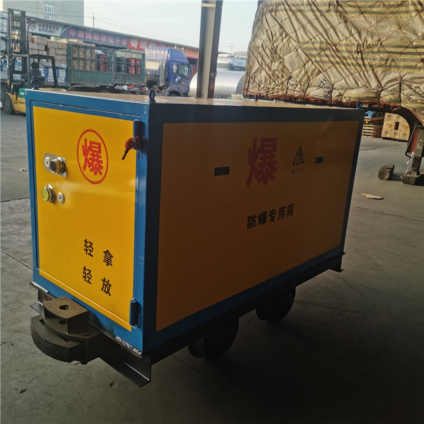 有轨式B破器材运输矿车可根据矿山轨道常用轨距,定制600/762/900mm的轨距,矿车轮径一般为350mm,如果承载量较大,也可采用400mm直径来加强支撑,存放柜部分材质为钢板+绝缘木板+抗震防静电的毡垫,更好的防护B破器材,使存放安全性更高。