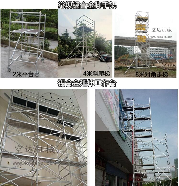 空达公司设计生产的新型铝合金移动脚手架,自有品牌“空达”(尤以GF50系列移动铝手脚架为代表),成为了脚手架运用中拥有标新立异的一种高空作业产品,广泛应用于:水电站、市政、建筑工地、大型商场、港口、加油站、学校等需要高空维护检修的场合。