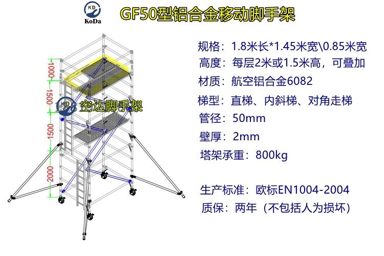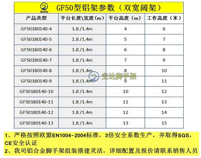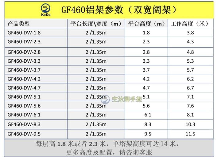 铝合金双宽脚手架的工作架可提供直爬梯、斜爬梯或走梯多项选择,适合在建筑和工业使用;垂直爬梯结构提供更大的工作空间,减少搭建时间;脚手架工作平台可设置于塔架任何阶段,每级高度为46cm;精细的组合设计拥有更大灵活性,提高利用率;安装简便快捷。