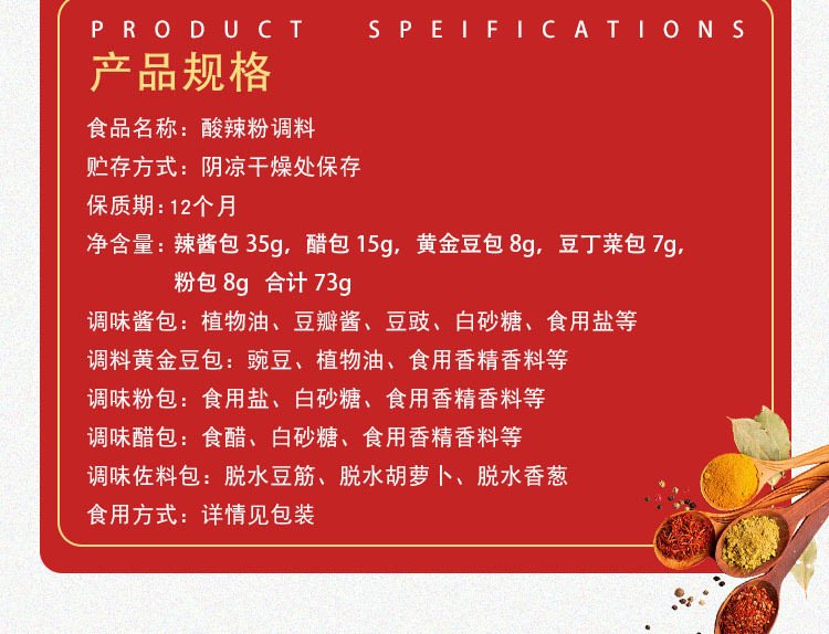 食用方法 | 作为酸辣粉调料使用,具体方法可参考包装说明 | ||