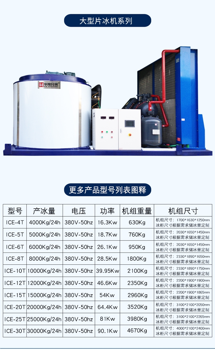一、华豫兄弟片冰机采用了模块设计,现场维护简单。制冰机蒸发桶采用SUS304不锈钢或碳钢镀铬制造,客户可根据自身情况选择使用。制冰机出冰干燥、纯净、无粉末、不容易产生结块。控制系统采用世界知名品牌的PLC控制,自动控制制冰机的整个制冰过程,有缺水、满水、高低压报警、反转等保护机制,使制冰机控制可靠、运行稳定、故障率低。片冰机组内刮式落冰系统,保证机组运行的持续性并使能量损耗降至最低。采用专利加工技术,确保高效的热传导性能,使片冰机组更加高效节能。