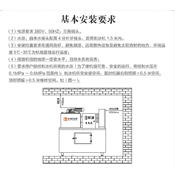 1)标准电压为380V-3P-50Hz,可根据客户实际要求生产电制为3相60Hz,200/220V、400V、440V的非标准型制冰机。