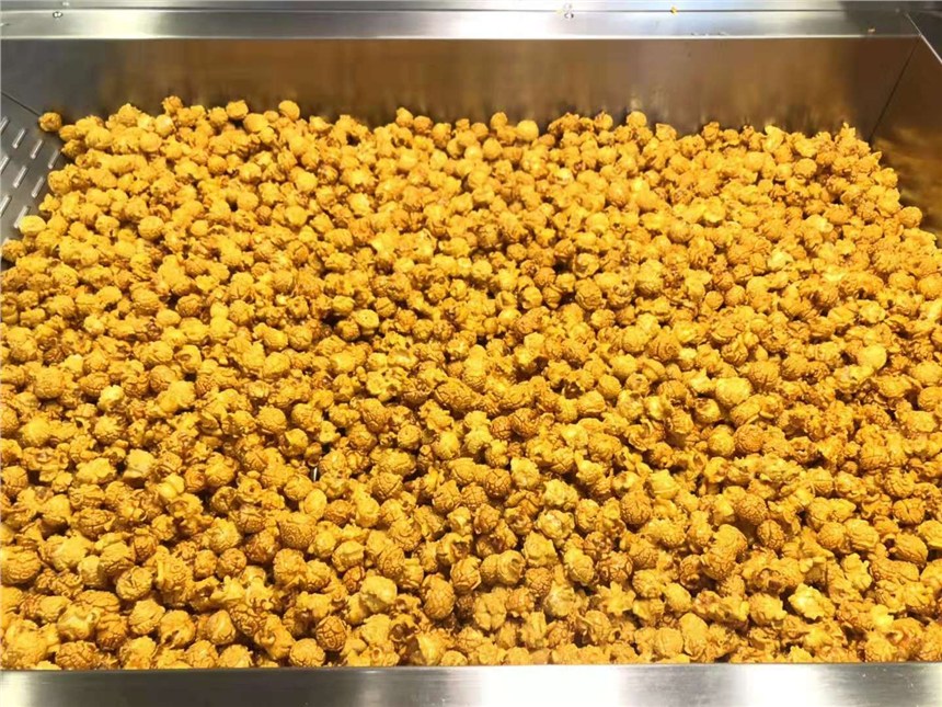 ⒊先放50毫升油,再放100克玉米及50克糖到盘内进行爆谷,待玉米爆裂完毕,几乎无爆裂声时(约5分钟),打开锅盖,倾倒出锅。