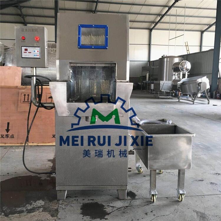盐水注射机针头通常采用长12cm,直径4mm的针头。采用齿形步进送料,步距准确。肉料由三组可拆卸的格条支撑。注射针采用气压弹簧控制,真正能够达到带骨注射。注射压力、注射率、步进距离和速度,可根据注射物料大小以及被注射物的组织结构,任意调整,能够达到注射效果。