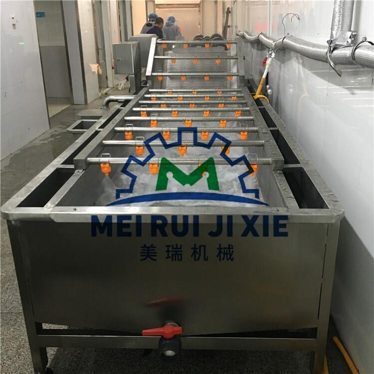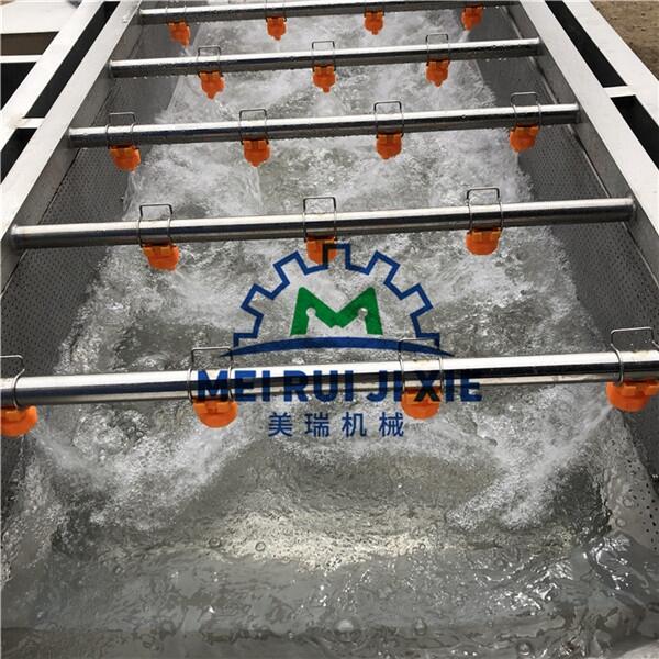 通过高压旋气泵使水发生翻滚、“沸腾”,使物料表面的尘土、泥沙迅速脱离主体,通过不锈钢网带,将清洗后的物料输入到下道工序,在出料端上部装有多个扇形喷嘴,对蔬菜进行二次清洗,达到良好的清洗效果。整体采用不锈钢制作,用户可根据工艺要求任意调整网带速度,从而使被清洗物得到 清洗。