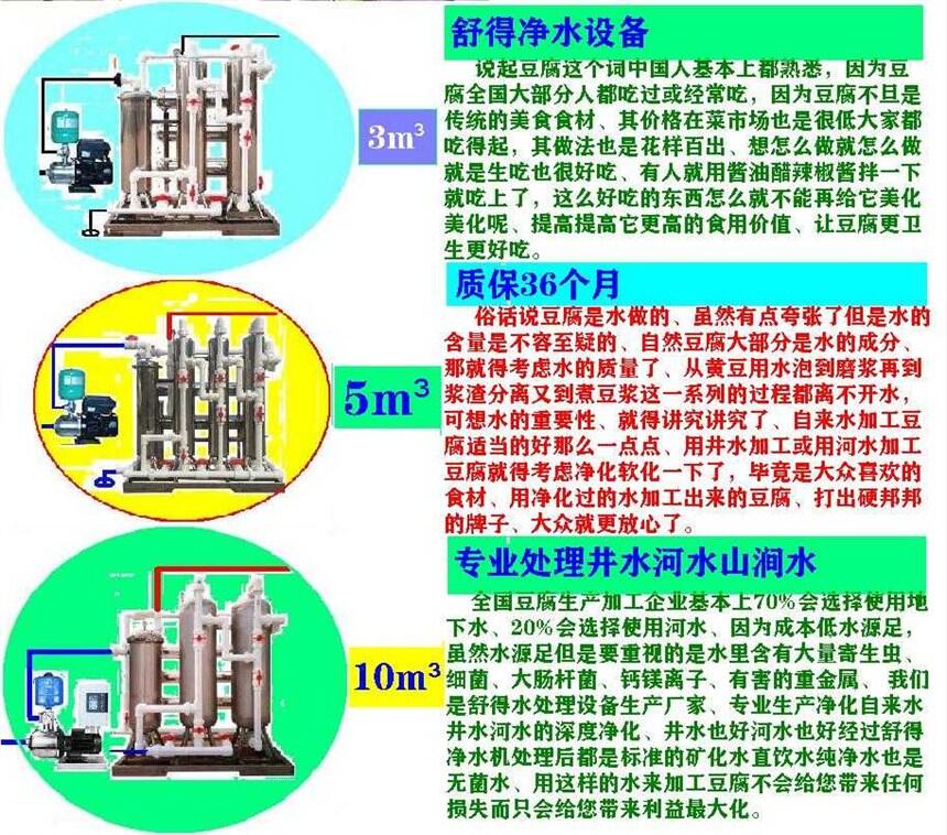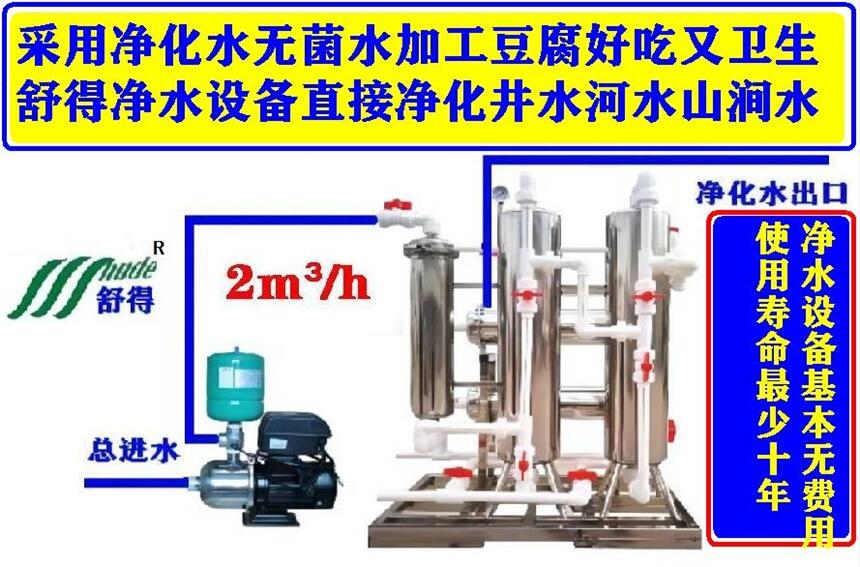 供应舒得牌豆制品加工设备不锈钢豆腐加工设备井水过滤器中央净水器,我们是舒得水处理设备生产厂家、业生产净化自来水井水河水的深度净化水处理设备、井水也好河水也好经过舒得净水机处理后都是标准的矿化水直饮水纯净水也是无菌水、用这样的水来加工豆腐不会给您带来任何损失而只会给您带来利益、因为卫生提高上去了效益能差吗对吧,这么多年下来全国购买我们的净水设备用于加工豆腐方面的不超过30家、而且大部分是河北省东北的豆腐加工企业,下面给大家介绍介绍净水设备的情况;