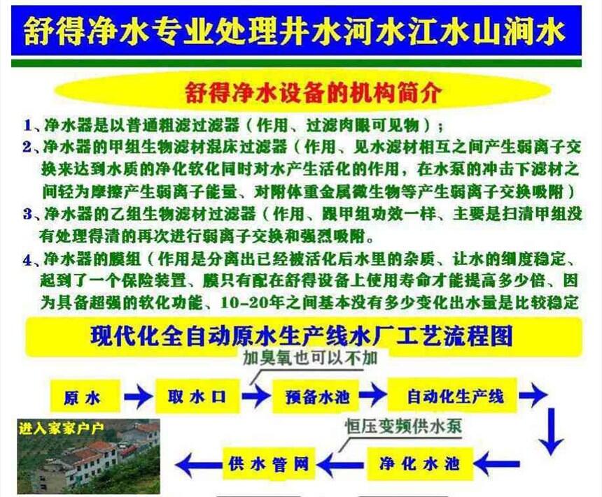 舒得欢迎国内外农村山村微小型水厂升级改造净化水无菌水厂、请考虑使用舒得牌井水河水等淡水专用不需要添加任何化工助剂的大型净水设备、农村水厂安装一套(大小规格齐全)舒得牌净水设备全村就可以天天喝上用上净化水无菌水、和城区供应的普通市政自来水来对比不知道高了多少个档次是没有可比性的、我是舒得欢迎您选购舒得净水设备!欢迎项目合作!