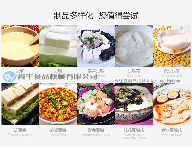 1、一机多用:可同时生产各式果蔬彩色豆腐、果蔬豆浆、营养豆花、美味豆奶等多种豆制品,还可以与其他设备和工艺配套生产更多豆制品。