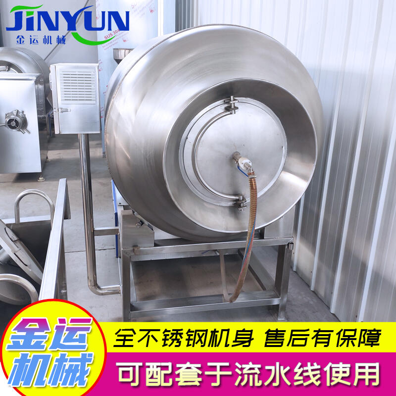 真空滚揉机是在真空状态下,利用物理冲击原理,让肉块或肉馅在滚筒内上下翻动,从而达到按摩、腌制作用。腌渍液被肉充分地吸收,增强肉的结着力和保水性,提高产品弹性及出品率。本机采用不锈钢制作,结构合理、运行平稳、噪音小、性能可靠、操作简便、设备适用效率高。