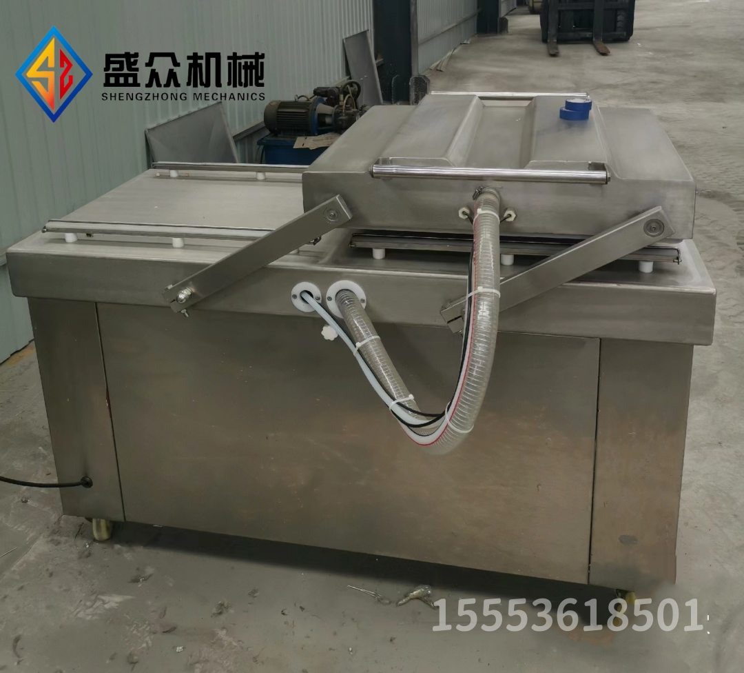 双室真空包装机由上工作室、下工作平台、机架、电器系统、真空系统五部分组成.工作原理:首先将包装物放置在工作平台上,将包装袋袋口平铺在硅橡胶条上,并用包装袋压条压住袋口。打开电源,选择加热温度,以及调整好抽气时间和加热时间,合盖后,包装机即可自动完成抽气-封口-冷却-起盖系列连续动作。(食品加工机械厂家Tel:155*5361-8501)