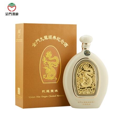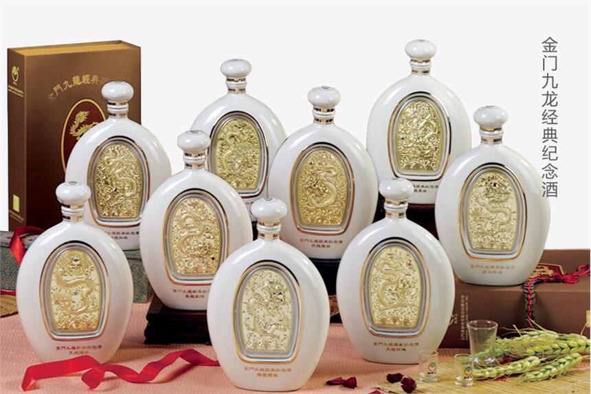 金门九龙经典纪念酒是金门高粱酒厂精心策划推出之具中国传统文化特色系列产品,以结合文化观光之推广。 由工艺师就本厂一九龙渊远之背景,融合传统金线雕工形式,并依方位陆续创做出九款