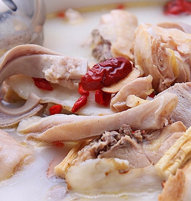 猪肚和鸡肉吃得差不多了, 再往汤里加入香菇、菜干等配菜,每加一样,汤的颜色和味道都会随之变化,滋味相当丰富。香菇入锅,可使胡椒味逐渐隐形,东莞御膳猪肚鸡立刻变身浓汤香菇炖鸡。放入菜干,则会饱吸肉味和香菇味,使一锅浓汤变得清香宜人,甜美可口。此时不但汤好喝,菜干 由于吸食了饱满的汤之精华,也别有一番风情,十分诱人!