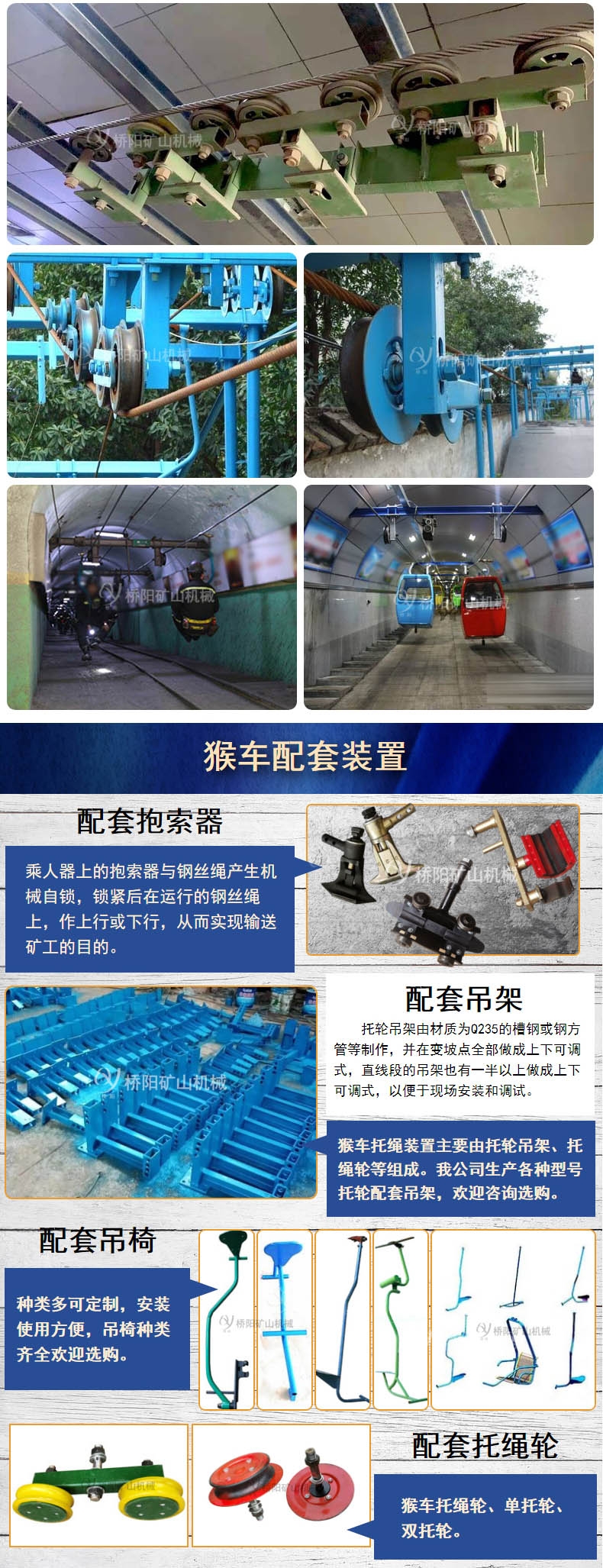 猴车,正式全称为矿山索道,主要用于地下矿山。由驱动装置输出动力带动钢丝绳循环无极运转,从而实现运送矿工上下井,以求缩短矿工上、下井的时间和减少矿工的体力消耗。其主要由驱动装置、乘人装置、回绳装置、张紧装置和电控系统组成。