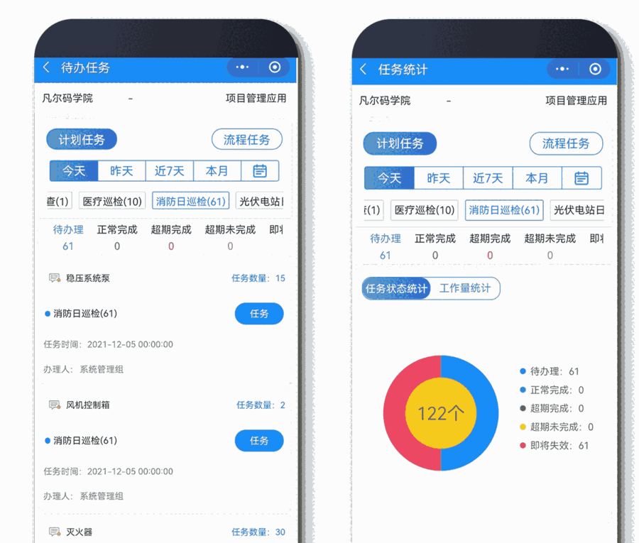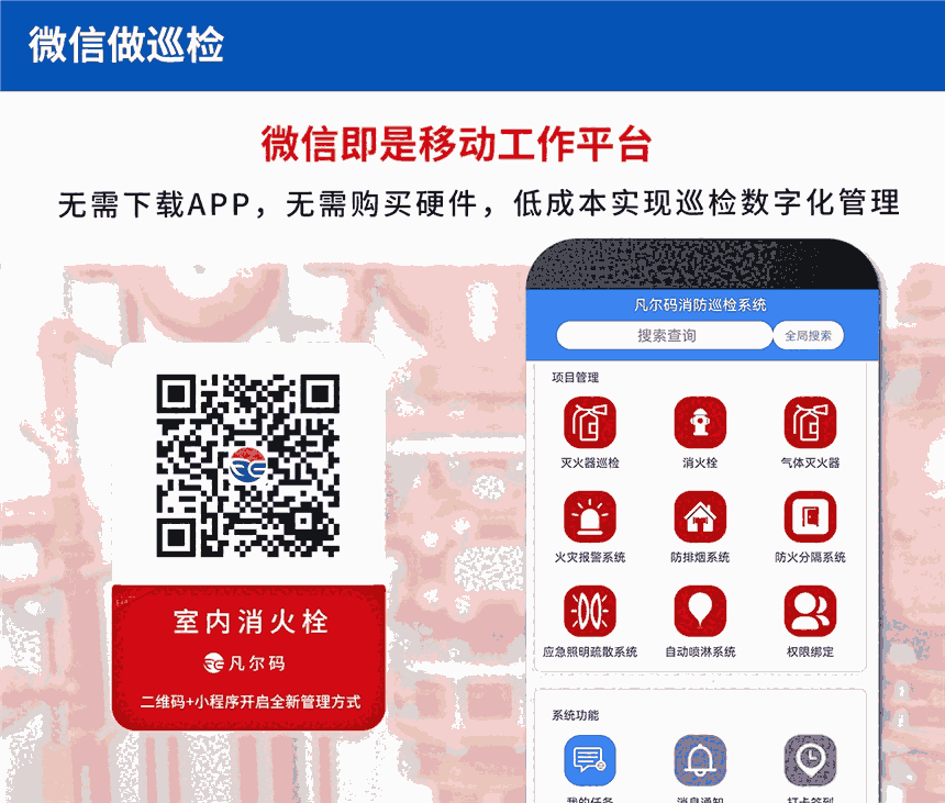 通过二维码+小程序搭建面向企业管理管理人员和内部\外部消防巡检人员的巡检系统;一方面,针对消防巡检利用图文引导,快速指引员工巡检,规范化巡检流程,及时提交巡检数据,提高巡检效率,减少漏检、误检;另一方面,使企业管理人员直观快捷的了解员工巡检情况,做到定时定点巡检,巡检数据回传后台可快捷了解巡检情况和设备状态。