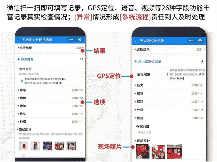 1、自定义检查项:在后台【表单管理】设置检查项目、添加巡检记录表单,关联消防器材二维码模板,微信扫码即可添加巡检记录,现场可实时定位、现场拍照、记录巡检情况;