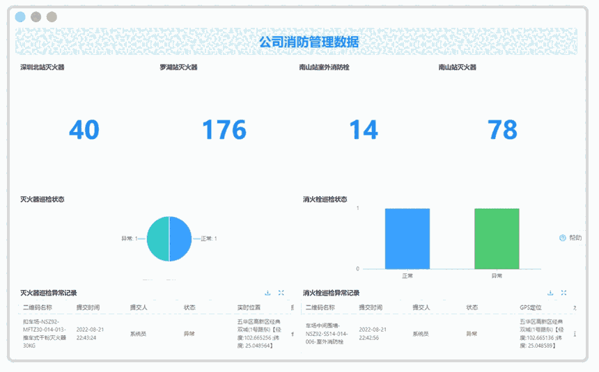 使用“二维码+小程序”搭建消防器材灭火器、消火栓管理系统,摆脱传统消防纸质巡检卡、避免浪费财力物力每年更换纸质检查卡、杜绝传统假检、漏检、记录整理繁琐的缺点;