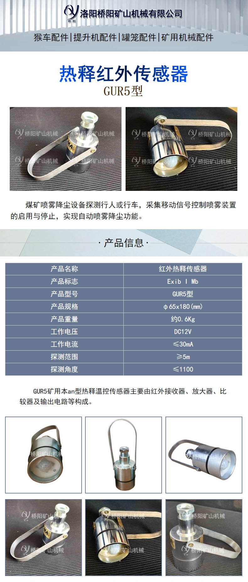 装载机用GUR5热释温控传感器人体传感器用途:用于煤矿井底车场、猴车沿线等场所作人员检测用,实现声光报jing或语音提示,提醒现场人员注意安全。