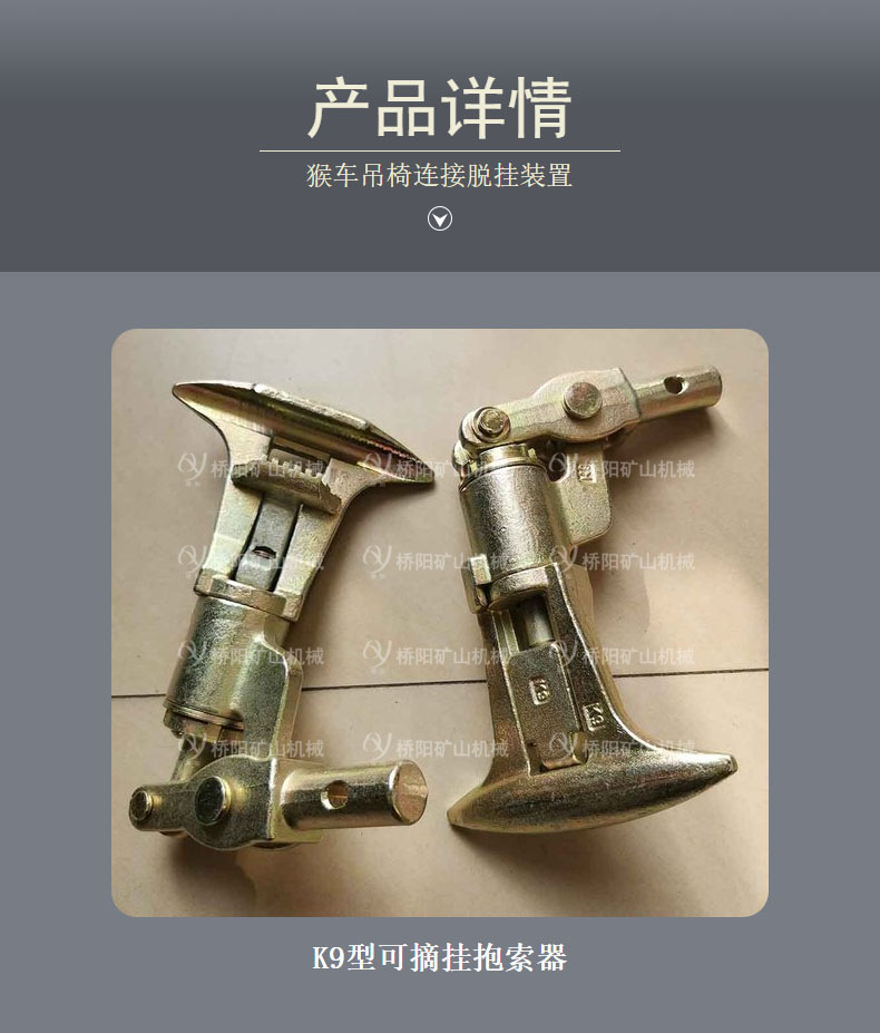 抱索器分为:固定式、活动卡钳式、活动摩擦式、可摘挂式抱索器、水平拐弯式。通常情况下常采用固定抱索器,该款抱索器即能满足自身与钢丝绳之间足够的压紧力,又能保持两者之间有一定的弹性余量。
